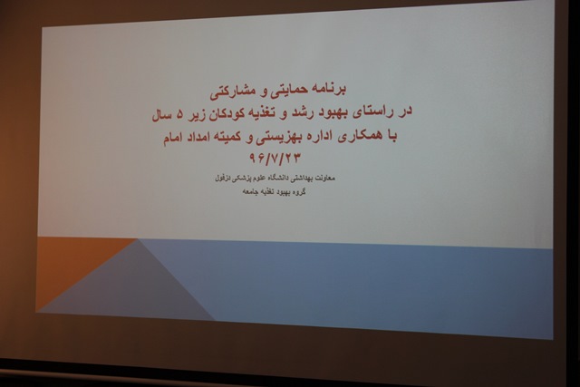 در راستای برنامه های سلامت کودکان زیر 5 سال و در جهت بهبود عملکرد دو برنامه حمایتی جلسه مشترکی با همکاری اداره بهزیستی و کمیته امدادامام خمینی شهرستان دزفول و با حضور کارشناسان تغذیه ستادی گروه بهبود تغذیه جامعه در تاریخ 23 مهر ماه 1396 در سالن آموزش معاونت بهداشتی برگزار شد .