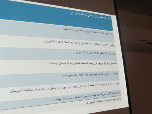 رضا پورآیین رئیس مرکز بهداشت شهرستان دزفول گفت: جلسه بهداشت کشاورزان شهرستان با حضور مسولین اداره جهاد کشاورزی ،دامپزشکی ،نظام صنفی کشاورزان ،ادراه شیلات و مسولین بهداشت محیط و حرفه ای شهرستان دزفول برگزار گردید. همچنین در ادامه به بیان ضرورت اجرای برنامه بهداشت کشاورزان با توجه به وسعت کار آنها سخنانی ایراد نمود. مصطفی بخشی مسئول واحد بهداشت حرفه ای مرکز بهداشت،در خصوص اقدامات انجام شده در جلسه قبل نکاتی را یادآور شد و خانم مریم بیتار کارشناس برنامه کشاورزان در رابطه با اقدامات انجام شده با این برنامه در سطح شهرستان مطالبی را ارائه داده و در نهایت اعضای حاضر به هم اندیشی در خصوص برنامه ها واهداف مرتبط با سلامت شاغلین پرداختند.