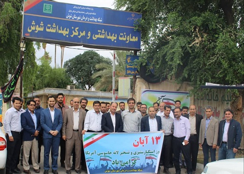 به گزارش روابط عمومی شبکه بهداشت و درمان شهرستان شوش، مدیر و کارکنان شبکه بهداشت و درمان شهرستان شوش در راستاي تجديد ميثاق با آرمان هاي والاي حضرت امام خميني (ره)، شهدا و مقام معظم رهبري و نيز اعلام انزجار از سياست هاي خصمانه دولت امريكا در راهپیمایی یوم الله ۱۳ آبان شرکت کردند.