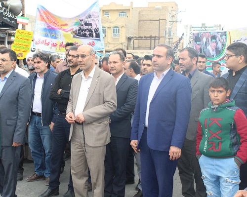 حضور پرشور مدیر و کارکنان شبکه بهداشت و درمان شوش در راهپیمایی ۱۳ آبان/ دکتر سواری: تحریم نمیتواند روند پیشرفت کشور کشور را متوقف کند