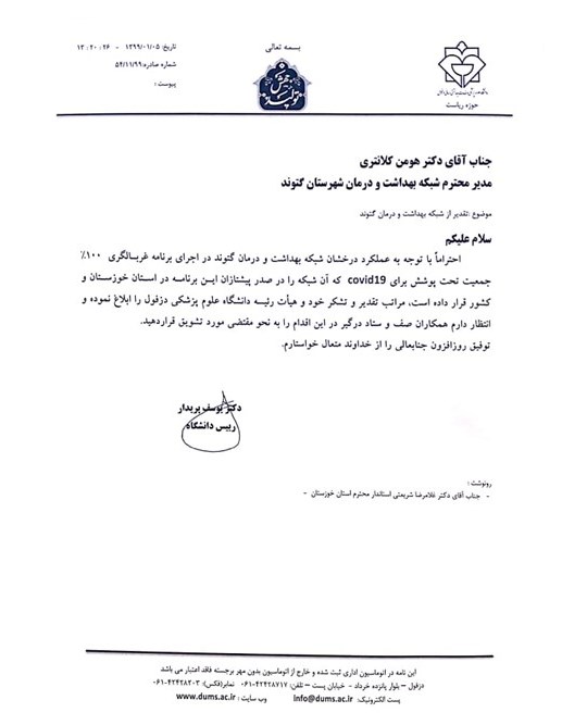 در این تقدیر نامه آمده است نظر به اجرای برنامه غربال گری صد درصدی کوید 19 که آن شبکه را درصدرپیشتازان این برنامه در استان خوزستان و کشور قرار داده است مراتب تقدیر و تشکر خود و هیات رئیسه دانشگاه علوم پزشکی دزفول را ابلاغ نموده و انتظار دارم همکاران صف و ستاد درگیر در این اقدام را به نحوه مقتضی مورد تشویق قرار دهید. رونوشت این تقدیر نامه جهت استحضار به استانداری خوزستان ارسال شده است.