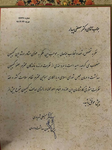 دکتر مصطفی پریدار با ابلاغ رئیس کمیسیون بهداشت و درمان مجلس بعنوان مشاور ارشد کمیسیون بهداشت مجلس شورای اسلامی منصوب شد
