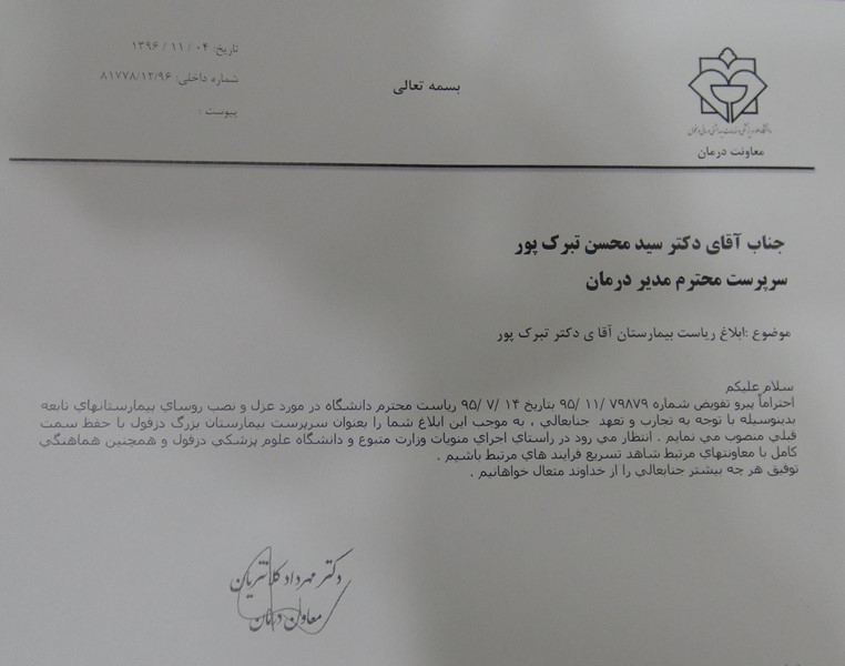 دکتر مهرداد کلانتریان معاون درمان دانشگاه علوم پزشکی دزفول طی ابلاغی دکتر سید محسن تبرّک پور را بعنوان سرپرست بیمارستان بزرگ دزفول منصوب کرد. در بخشی از این ابلاغ آمده است انتظار می رود در راستای اجرای منویات وزارت مطبوع و دانشگاه علوم پزشکی دزفول عمل نمایید.