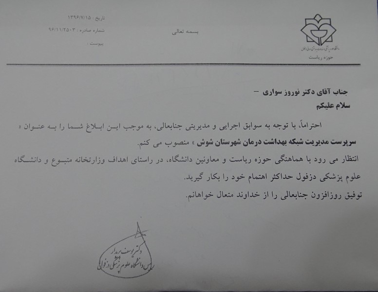 دکتر یوسف پریدار رئیس دانشگاه علوم پزشکی دزفول، طی ابلاغی دکتر نوروز سواری را بعنوان سرپرست مدیریت شبکه بهداشت و درمان شهرستان شوش منصوب کرد.