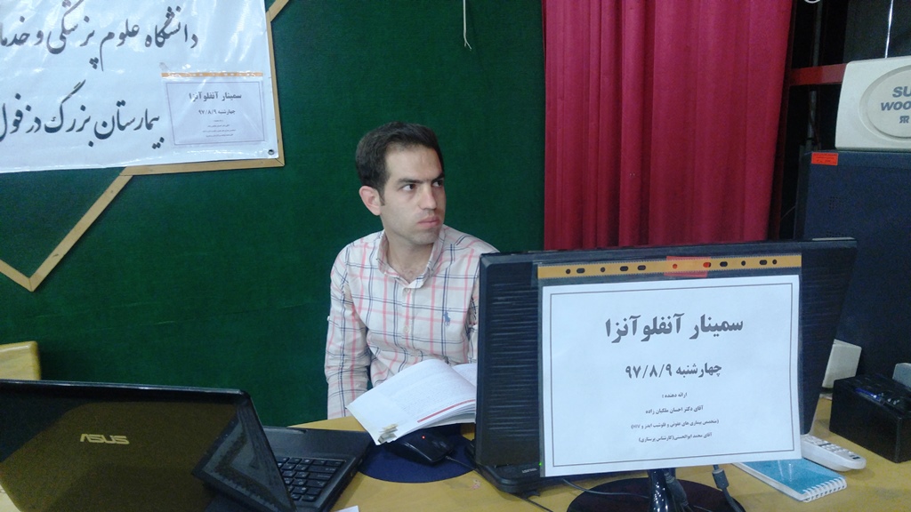 چهارشنبه9ابان سمینارآنفلوانزاباحضوردکتراحسان ملکیان متخصص عفونی ومحمدابولحسنی کارشناس پرستاری وباشرکت کلیه کارکنان درمانی وغیردرمانی درسالن ولایت بیمارستان بزرگ دزفول برگزارشد.
