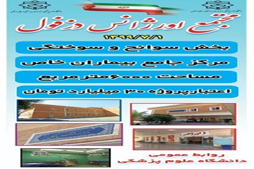 به گزارش روابط عمومی بیمارستان بزرگ دزفول با حضور رئیس دانشگاه علوم پزشکی دزفول دکتر علی قمیشی،امام جمعه دزفول حجه الاسلام قاضی دزفولی واعضای محترم هیئت رئیسه ومعاونین دانشگاه علوم پزشکی دزفول دربرنامه ویدئوکنفرانسی با وزیر محترم بهداشت دکتر نمکی مجتمع اورژانس بیمارستان بزرگ دزفول شامل بخش سوانح سوختگی،مرکز جامع بیماران خاص به مساحت شیش هزاز متر واعتبار30میلیارد تومان در تاریخ 1399/7/1به بهره برداری رسید.