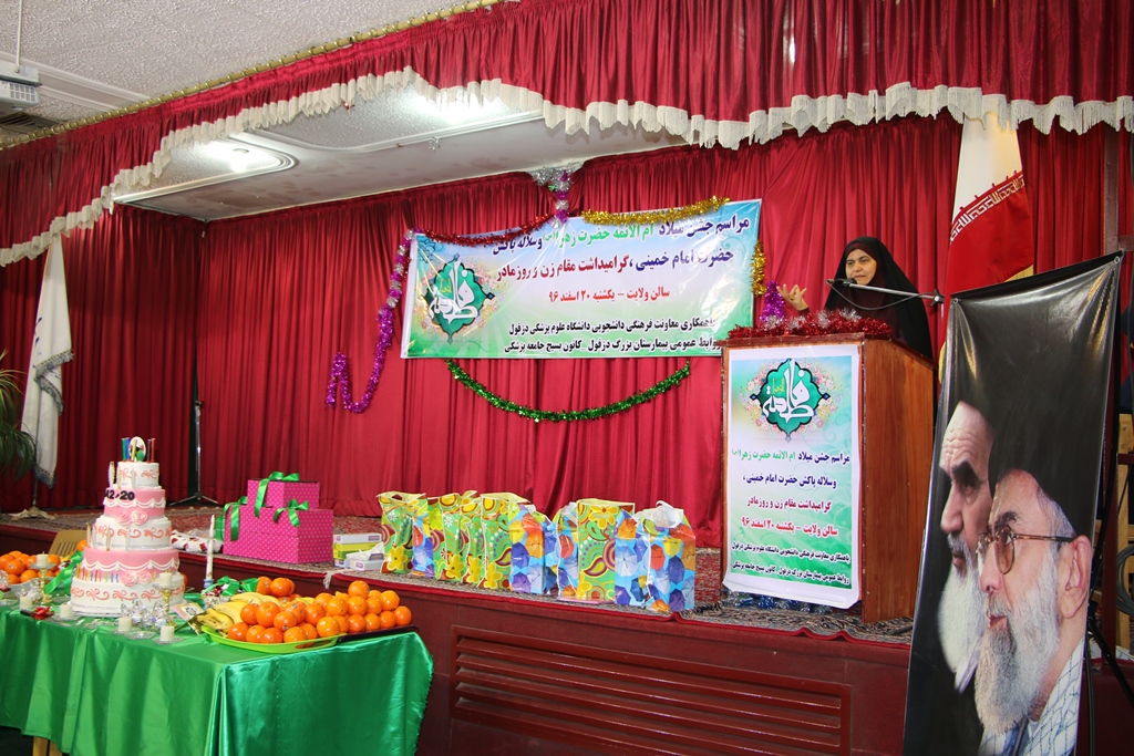 سخنران این مراسم فرخنده مخدوم مسول اداراه بازرسی دانشگاه علوم پزشکی وپرستارسابق بیمارستان بااشاره به جایگاه حضرت فاطمه(س)به نمونه هایی اززندگانی آن حضرت ازجمله تقسیم کاربین زن ومرد،خدامحوری وفرمایشات حضرت رسول درموردایشان اشاره کردوباطرح سولاتی بامشارکت حاضران این بحث راهمگانی کرد.