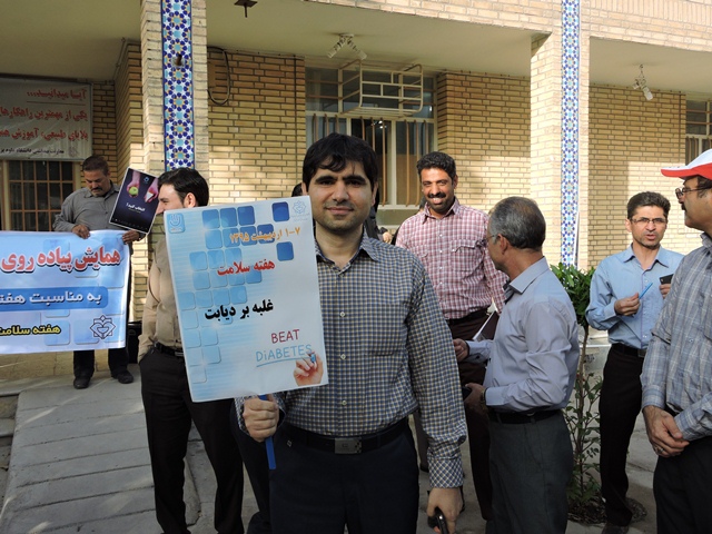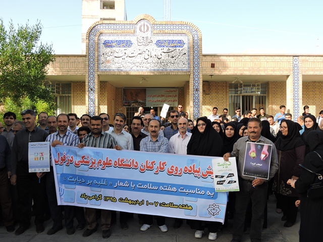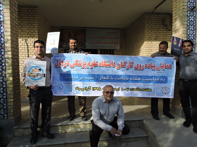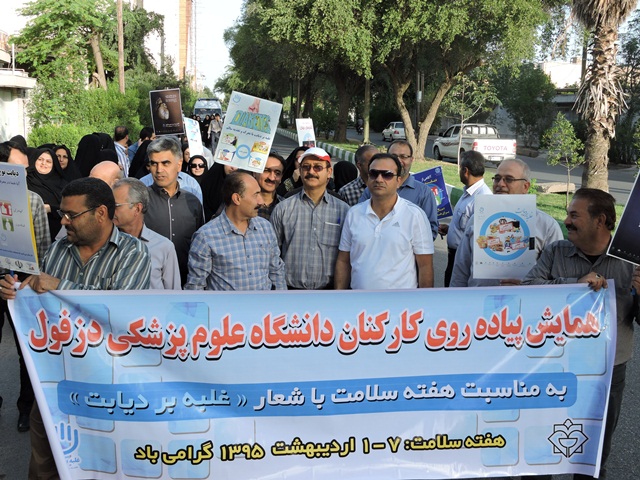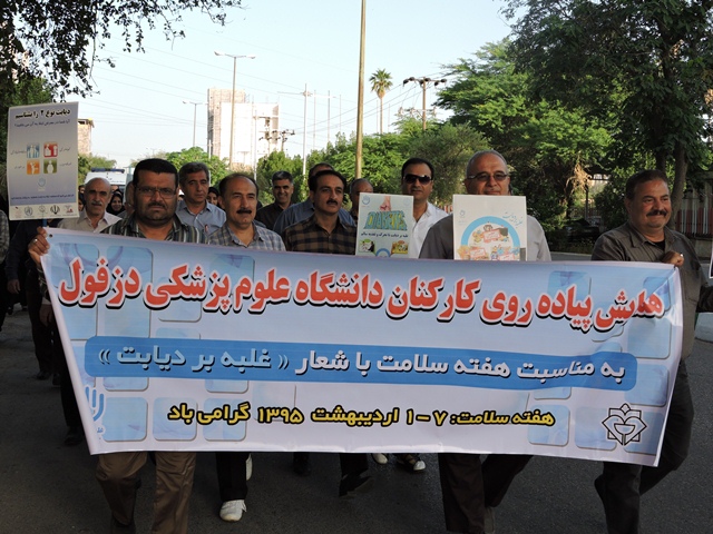 به گزارش خبرنگار وب دا، در چهارمین روز از هفته سلامت با شعار غلبه بر دیابت مراسم پیاده روی کارکنان و دانشجویان دانشگاه علوم پزشکی دزفول با حضور رئیس دانشگاه و معاونین  ایشان برگزار شد. این راهپیمایی از محل معاونت درمان و دارو  با نظارت پرسنل راهنمایی و رانندگی شروع و در معاونت بهداشتی به اتمام رسید. در ادامه مراسم دکتر پریدار ریاست دانشگاه علوم پزشکی دزفول مطالبی را در خصوص دیابت به اطلاع حاضرین رساند و در پایان جوایزی به قید قرعه اهدا گردید.