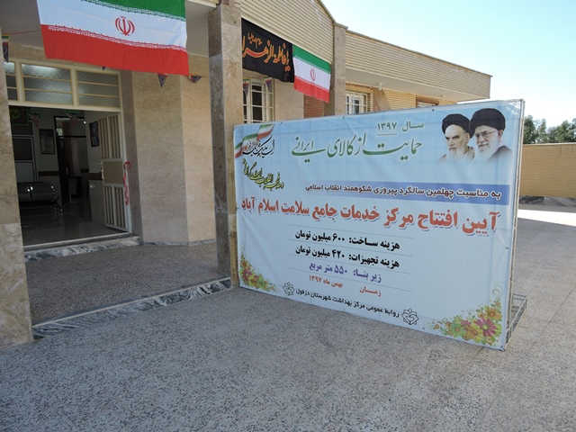 در ایام الله دهه مبارک فجر با حضور دکتر پریدار رییس دانشگاه علوم پزشکی دزفول، دکتر چلوی معاون سیاسی فرمانداری ویژه شهرستان دزفول، رییس مرکز بهداشت شهرستان دزفول، بخشدار چغامیش، دهیار و اعضای شورای روستا، مرکز خدمات جامع سلامت اسلام آباد به بهره برداری رسید.