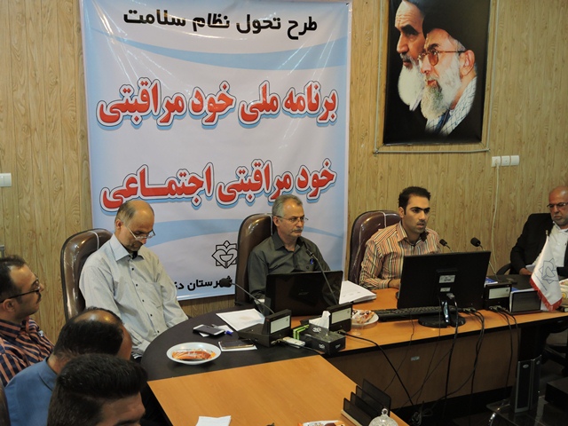 در راستای اجرای برنامه ملی خودمراقبتی ( خودمراقبتی اجتماعی) پنجمین برنامه از طرح تحول نظام سلامت، جلسه ای با حضور مهندس پورآیین ریاست محترم مرکز بهداشت شهرستان دزفول، پورخطیبی مدیر گروه آموزش و ارتقاء سلامت معاونت بهداشتی و احسان بخش مسئول آموزش ارتقاء سلامت ستاد مرکز بهداشت و با حضور بخشداری ها، دهیاریها و شوراهای اسلامی روستاها و همچنین آقای کریمی ریاست محترم شورای اسلامی شهرستان دزفول در روز یکشنبه مورخ 16/3/95 ساعت 10 در سالن شماره 1 مرکز بهداشت شهرستان دزفول برگزار گردید.
