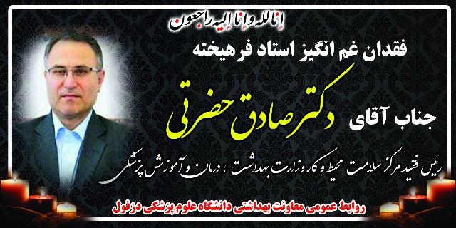 در پی درگذشت ناگهانی دکتر صادق حضرتی رییس فقید مرکز سلامت محیط و کار وزارت بهداشت درمان و آموزش پزشکی، دکتر مسعودی فر معاون بهداشت دانشگاه علوم پزشکی دزفول این ضایعه را به خانواده آن مرحوم و جامعه بهداشتی کشور تسلیت گفت.