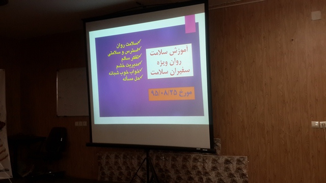 در راستای اجرای طرح سفیران سلامت دانش آموزی کارگاه آموزشی کتاب راهنمای خود مراقبتی در تاریخ 25/8/95 برای سفیران سلامت ویژه دانش آموزان دختر متوسطه اول، جهت مربیان بهداشت و رابطین بهداشت مدارس در سالن مرکزبهداشت شهرستان دزفول برگزار گردید.