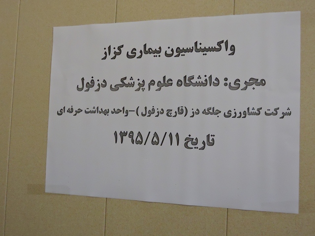 با مساعدت رئیس مرکز بهداشت دزفول جهت کلیه پرسنل شرکت کشاورزی جلگه دز دزفول به تعداد 196 نفر واکسن توام بزرگسالان(دیفتری – کزاز) تلقیح گردید.