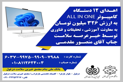 مدیرعامل مجمع خیرین سلامت دزفول اعلام کرد : 12دستگاه رایانه All in one به ارزش 326 میلیون تومان به همت خیر عرصه سلامت جناب آقای منصور مقدمی به معاونت آموزشی ، تحقیقات و فناوری دانشگاه علوم پزشکی دزفول اهدا شد