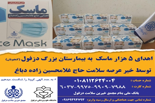 با همت خیرعرصه سلامت آقای حاج غلامحسین زاده دباغ 5 هزار ماسک پرستاری به بیمارستان بزرگ دزفول( گنجویان) اهدا شد.