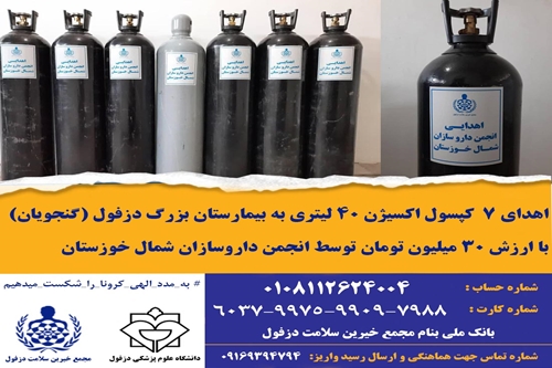 اهدای 7 کپسول اکسیژن 40 لیتری به بیمارستان بزرگ دزفول (گنجویان)