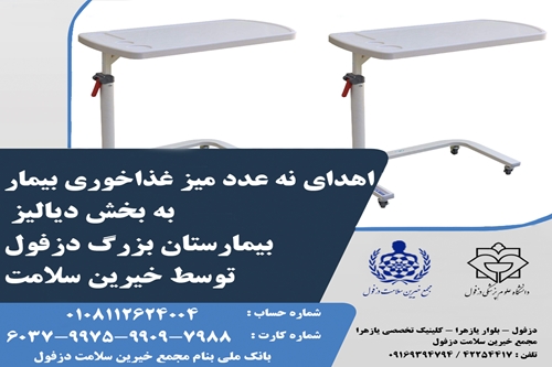 مدیرعامل مجمع خیرین سلامت دزفول اعلام کرد: تعداد 9 میز غذا خوری بیمار به بخش دیالیز بیمارستان بزرگ دزفول اهدا شد.