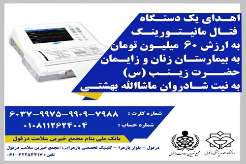 مدیرعامل مجمع خیرین سلامت دزفول اعلام کرد: یک دستگاه فتال مانیتورینگ به ارزش ۶۰ میلیون تومان به بیمارستان زنان و زایمان حضرت زینب (س) به نیت شادروان جناب آقای حاج ماشاءالله بهشتی اهدا شد.
