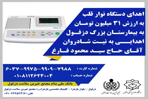 مدیرعامل مجمع خیرین سلامت دزفول اعلام کرد: یک دستگاه نوار قلب (الکتروکاردیوگراف) به ارزش ۳۱ میلیون تومان به بیمارستان بزرگ دزفول به نیت شادروان آقای حاج سیدمحمود فارغ اهدا شد.