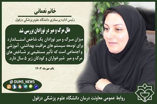 رئیس اداره پرستاری دانشگاه علوم پزشکی دزفول اعلام کرد: شناسایی علل مرگ و میر اولین گام در کاهش مرگ و میر و ارتقاء سطح این شاخص در نوزادان است.