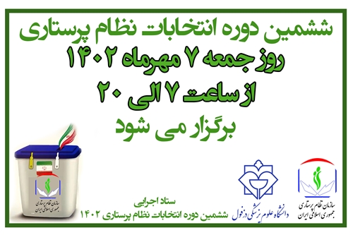 رئیس هیئت اجرای ششمین دوره انتخابات نظام پرستاری حوزه دزفول خبر داد: فردا جمعه هفتم مهرماه 1402 ششمین دوره انتخابات سازمان نظام پرستاری دانشگاه علوم پزشکی دزفول برگزار می شود.