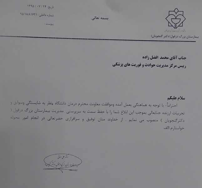 دکتر علی منانی سرپرست بیمارستان بزرگ دزفول طی ابلاغی محمد افضل زاده را بعنوان سرپرست مدیریت بیمارستان بزرگ دزفول منصوب کرد .