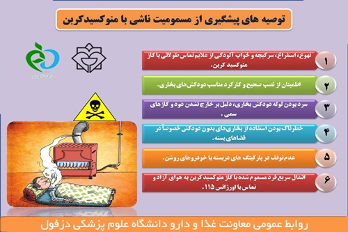 مدیر دارویی دانشگاه برخی از علایم و نشانه های مسمومیت با این گاز خطرناک را یادآور شد و گفت: در اثر تماس طولانی با منوکسیدکربن سردرد، گیجی، ضربان شدید شقیقه ها، وزوز گوش و خواب آلودگی، تهوع، استفراغ، تپش قلب، کاهش هوشیاری، آسیب دائمی عصبی، کُما و حتی مرگ رخ می ‏دهد.
