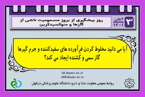 برای چندمین سال متوالی هفته اول آبان توسط وزارت بهداشت،درمان و آموزش پزشکی هفته پیشگیری از بروز مسمومیت ها نامگذاری شده است و سوم آبان روز پیشگیری از بروز مسمومیت ناشی از گازها و منوکسیدکربن می باشد.