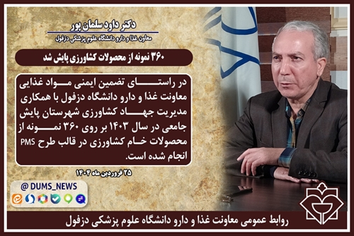 معاون غذا و دارو دانشگاه علوم پزشکی دزفول خبر داد: در سال 1403 پایش جامعی بر روی ۳۶۰ نمونه از محصولات خام کشاورزی در قالب طرح PMS انجام شد.